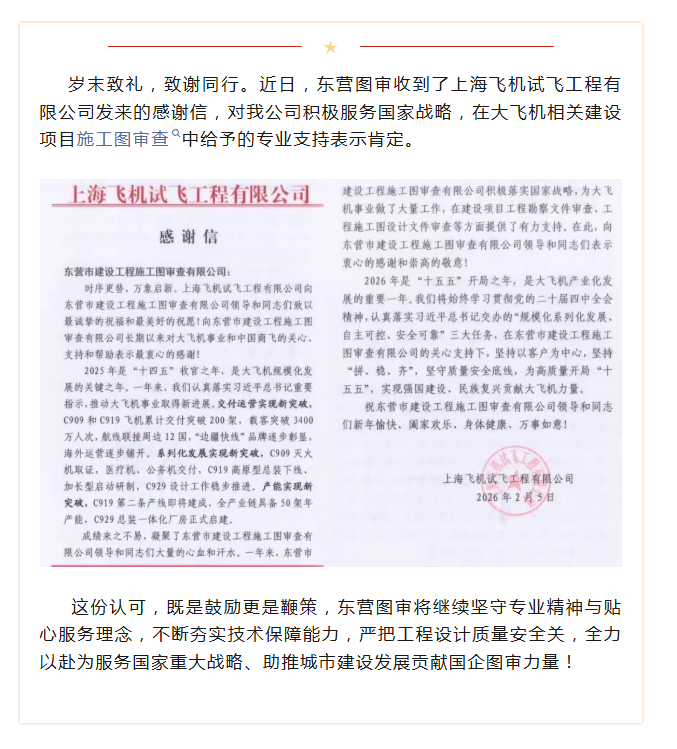 一封来自上海飞机试飞工程有限公司的感谢信
